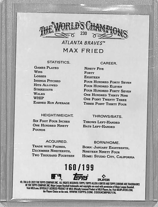 2022 Topps Allen and Ginter Chrome Refractor Magenta #230 Max Fried NM-MT 160/199 Atlanta Braves