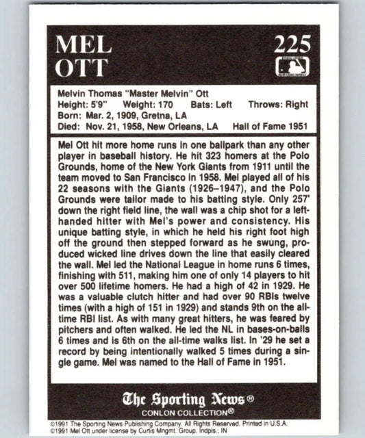 1991 Conlon Collection #225 Mel Ott EX Excellent New York Giants Baseball Card