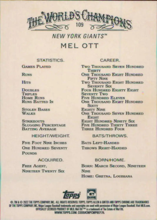 2022 Topps Allen and Ginter Chrome #109 Mel Ott NM-MT New York Giants Baseball Card