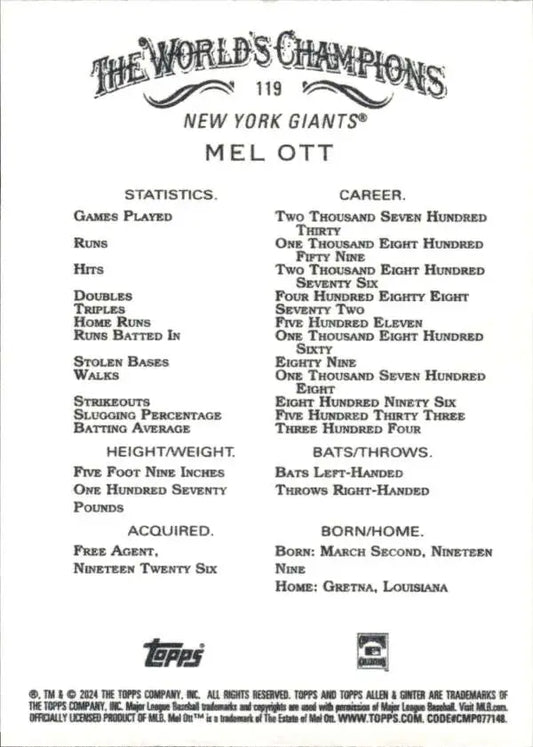 2024 Allen & Ginter #119 Mel Ott NM-MT San Francisco Giants Baseball Card