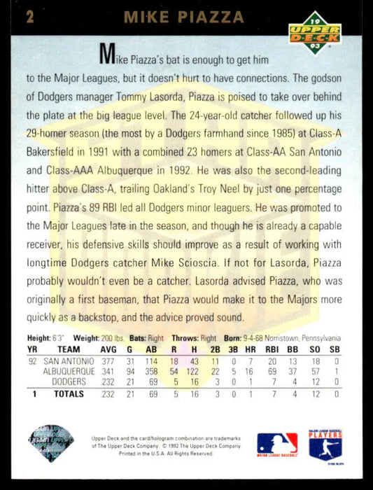 1993 Upper Deck #2 Mike Piazza EX/NM Los Angeles Dodgers Baseball Card