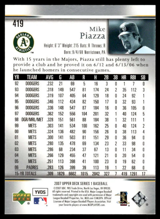 2007 Upper Deck #419 Mike Piazza EX/NM Oakland Athletics Baseball Card