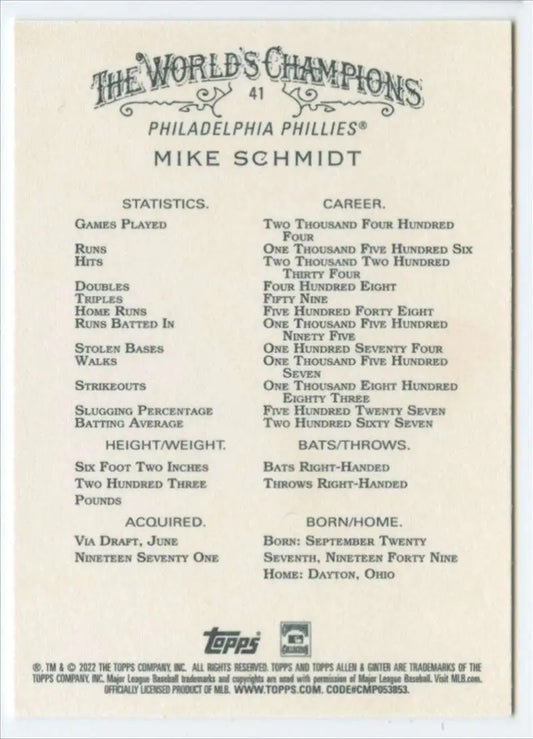 2022 Topps Allen and Ginter #41 Mike Schmidt NM-MT Philadelphia Phillies Baseball Card