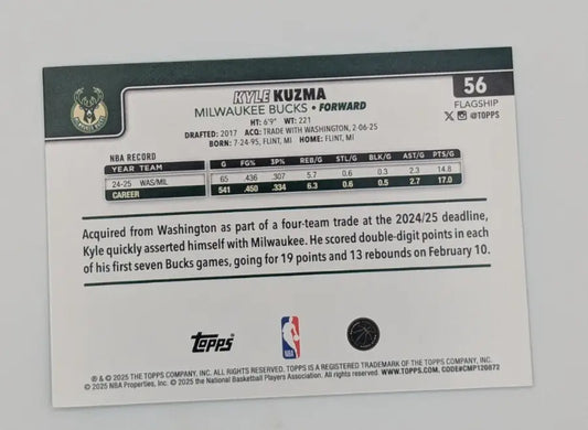 Topps Basketball 2025-26 Kyle Kuzma Topps Green Refractor Milwaukee Bucks /99