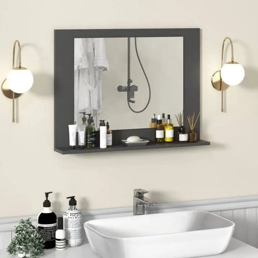 Rectangular 23 x 17 inch Bathroom Mirror with Storage Shelf in Grey Wood Finish
