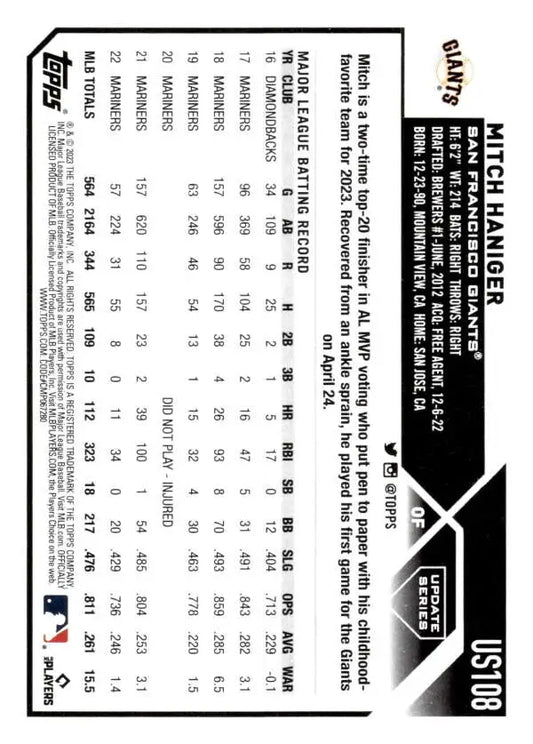 2023 Topps Update Series #US108 Mitch Haniger NM-MT San Francisco Giants Baseball Card