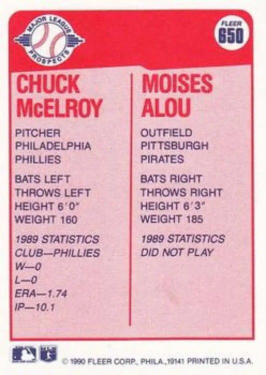 1990 Fleer #650 Chuck McElroy/Moises Alou NM-MT RC Rookie Pittsburgh Pirates/Philadelphia Phillies Baseball Card