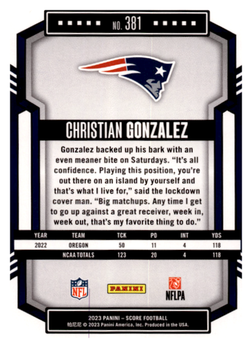 2023 Score Red #381 Christian Gonzalez NM Near Mint RC Rookie Patriots ID:64956