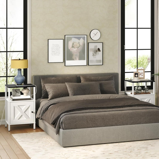 Farmhouse Nightstand with Charging Station, White Bedside Table with Usb&Type-C Ports and Outlets, End Table with Storage, Night Stand for Bedroom, White and Black ETBW96E01
