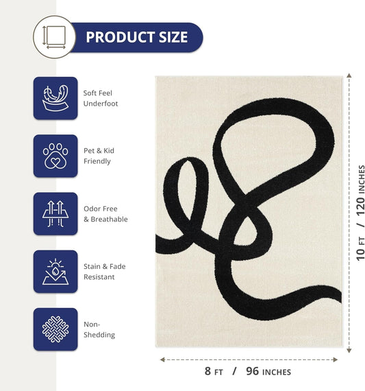 Abstract Beige/Black Area Rug - 8'X10' - Modern Curved Line Design - Deco Collection - Easy to Clean - Durable for High Traffic Areas - Living Room, Dining Room - Medium Pile