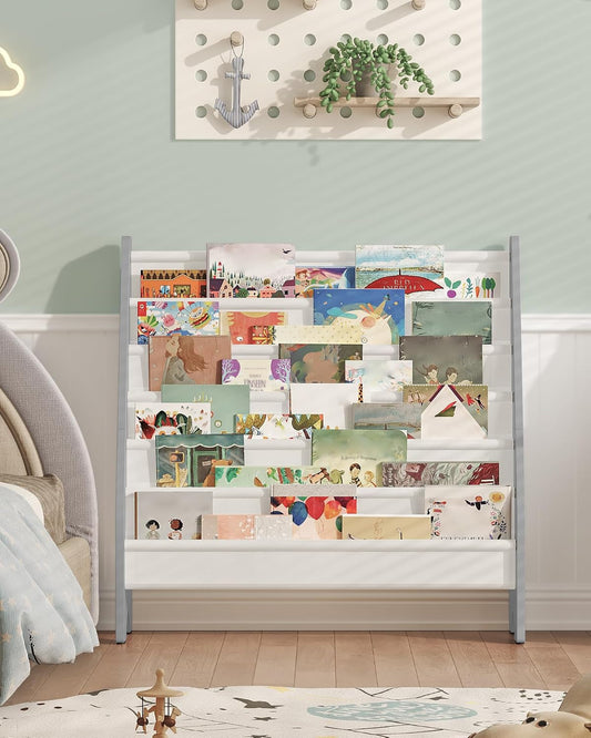 6-Tier Kids Bookshelf, Kids Sling Bookcase, Magazine and Book Storage Rack, Large Capacity Book Organizer, Book Shelf for Kids Room, Bedroom, Nursery, Playroom, White and Gray MCW07WG