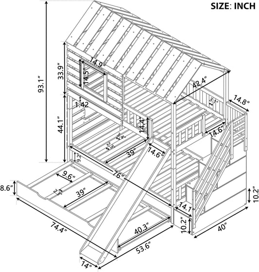 Twin over Twin House Bunk Bed, Wooden Bed Frame with Trundle and Slide, Storage Staircase, Roof and Window Design, Gray