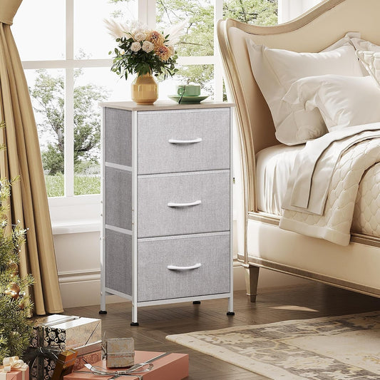 Nightstand with 3 Drawers, Fabric Dresser, Organizer Unit, Storage Dresser for Bedroom, Hallway, Entryway, Closets, Sturdy Steel Frame, Wood Top, Easy Pull Handle, Light Grey