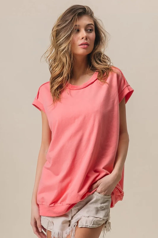 POL Round Neck Short Sleeve Contrast Stitching Top with Back Strap Detail