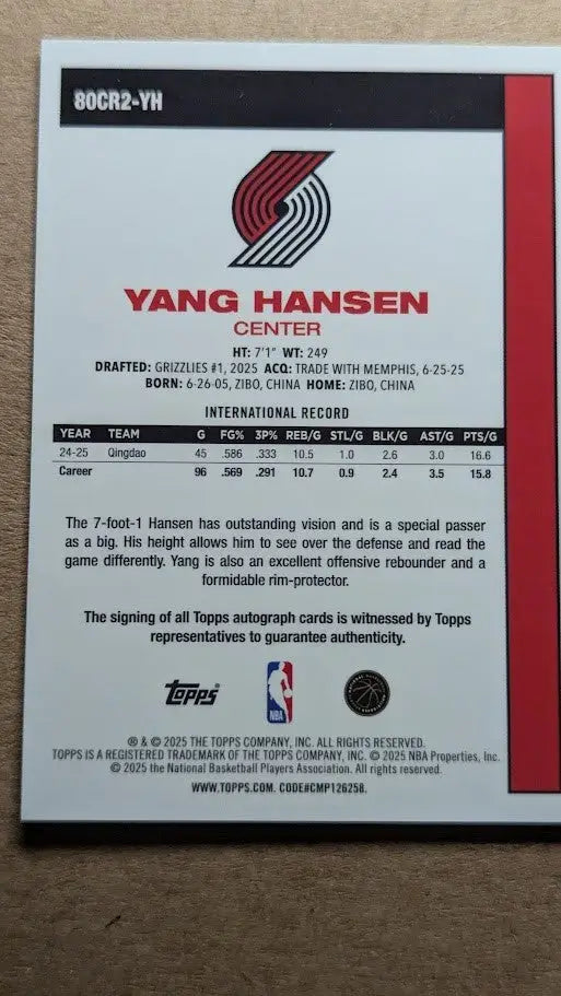 2025-26 Topps Chrome Yang Hansen Rc Mojo Auto 45th Anniversary Trail Blazers