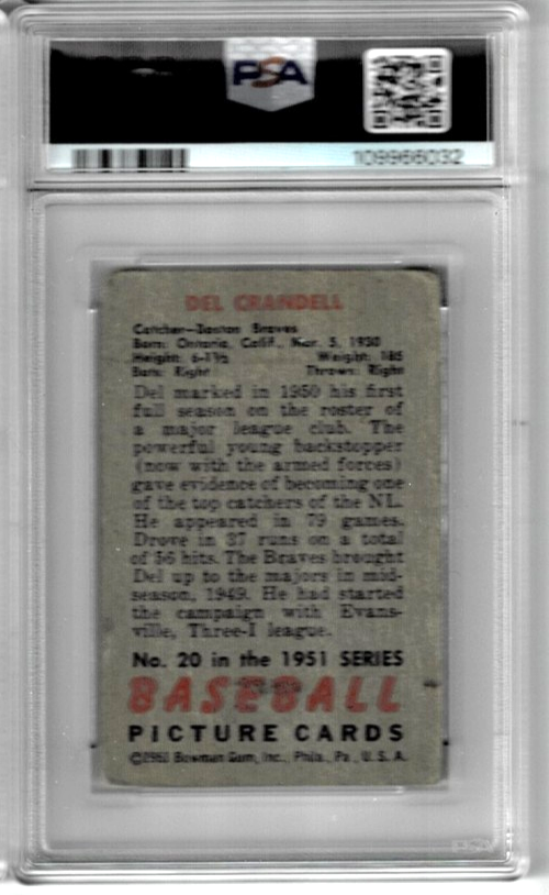 1951 Bowman Del Crandall #20 Signed Auto Card Boston Braves PSA/DNA 9