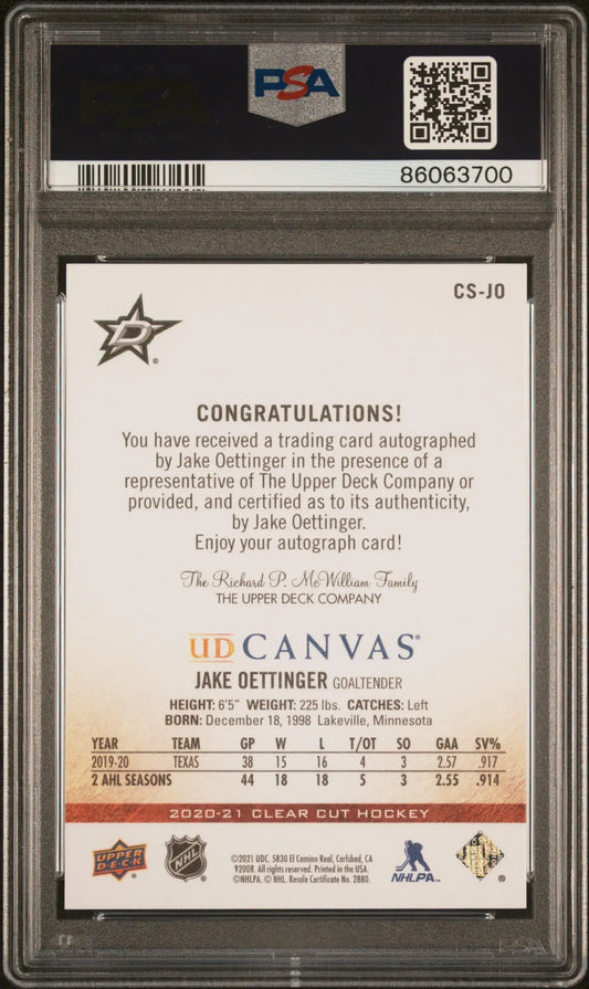 Jake Oettinger 2020 Upper Deck Clear Cut Canvas Auto #21/29 PSA 10 Gem Mint