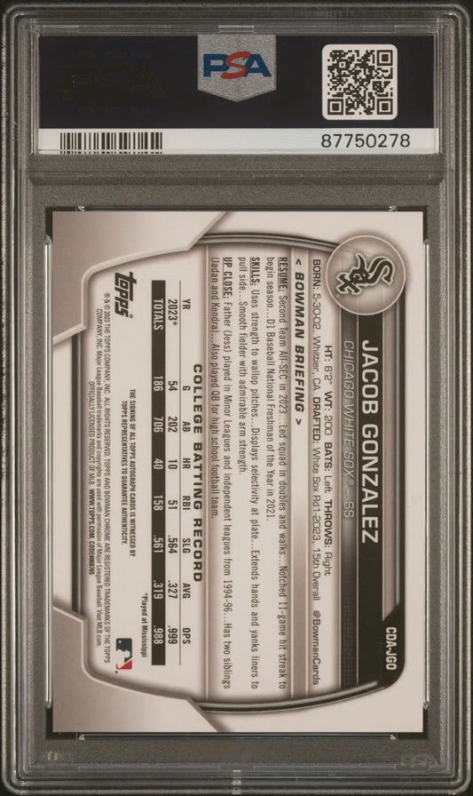 Jacob Gonzalez 2023 Bowman Chrome Autograph PSA 10 Gem Mint