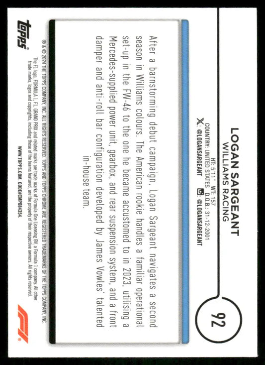 2024 Topps Chrome F1 Logan Sargeant #92 Racing