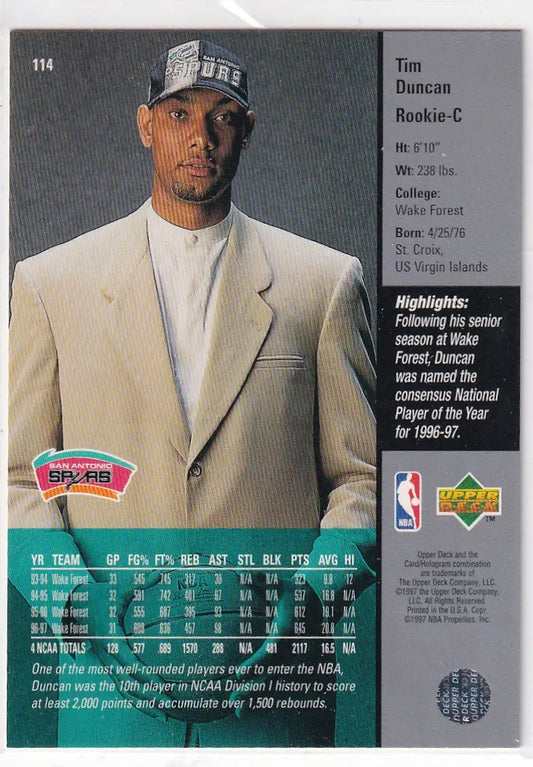 1997 UPPER DECK #114 TIM DUNCAN- SAN ANTONIO SPURS