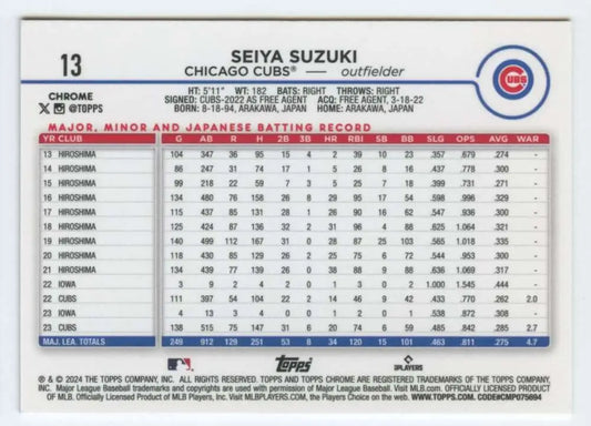 2024 Topps Chrome #13 Seiya Suzuki NM-MT Chicago Cubs Baseball Card
