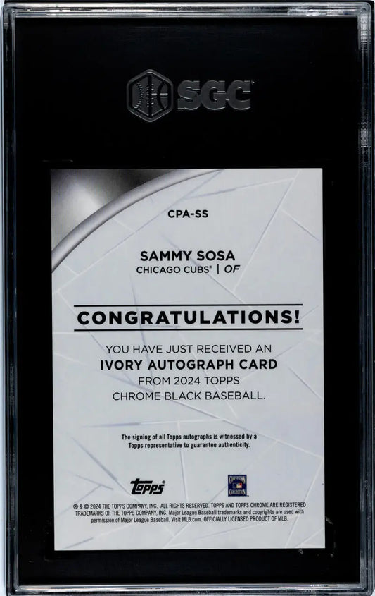 2024 Topps Chrome Black Ivory Refractor #CPA-SS Sammy Sosa SGC 10 Gem Auto 36/50 Chicago Cubs Baseball Card