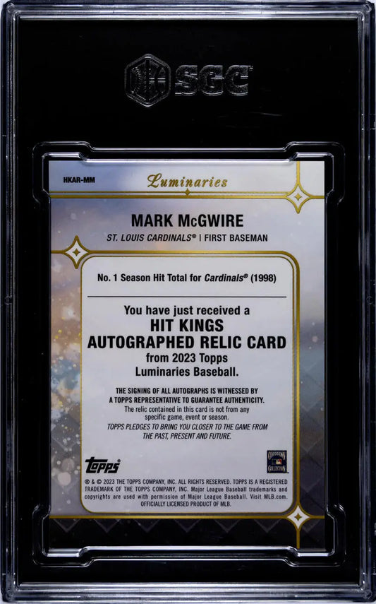 2023 Topps Luminaries #HKAR-MM Mark McGwire SGC 9 MINT MEM Auto 6/10 St. Louis Cardinals Baseball Card