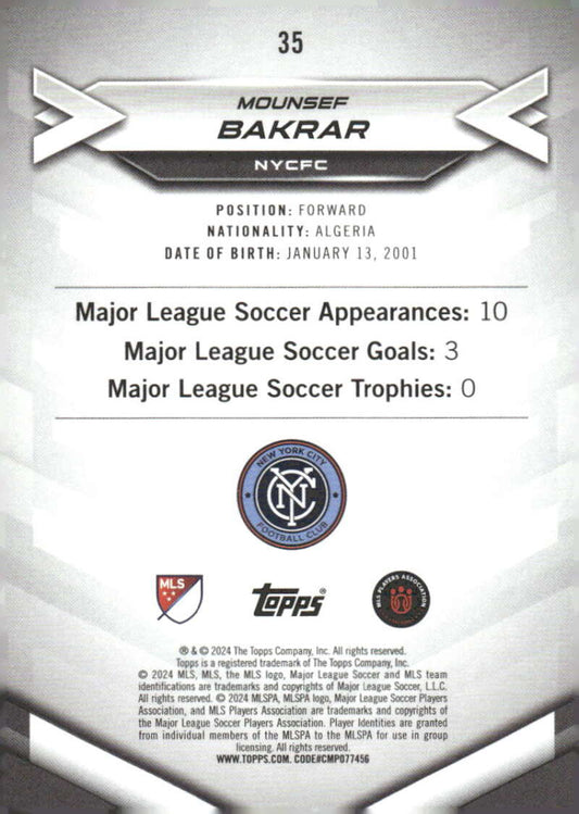 2024 Topps MLS Superstars #35 Mounsef Bakrar NM-MT RC Rookie NYCFC Soccer Card
