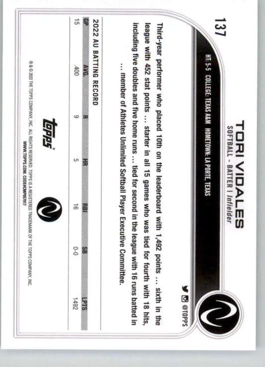 2023 Topps Athletes Unlimited All Sports 137 Tori Vidales Softball