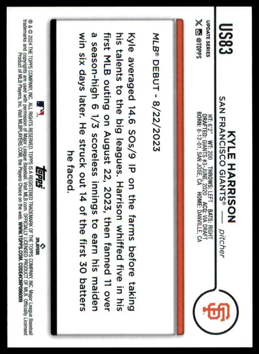 Kyle Harrison 2024 Topps Update #US83 San Francisco Giants