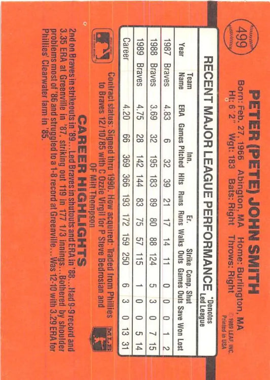 1990 Donruss #499 Pete Smith VG-EX Atlanta Braves Baseball Card