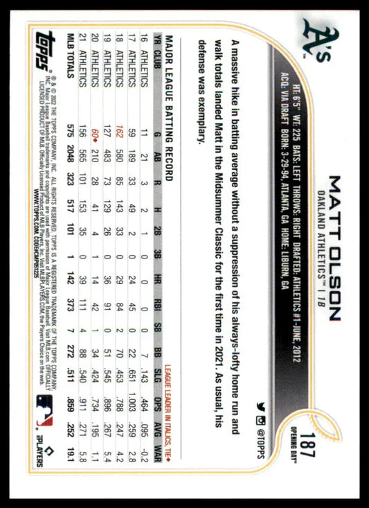 Matt Olson 2022 Topps Opening Day #187 Oakland Athletics