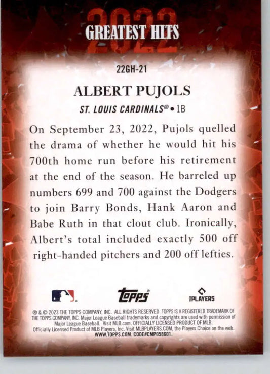 2023 Topps 2022 Greatest Hits #22GH-21 Albert Pujols NM-MT St. Louis Cardinals Baseball Card