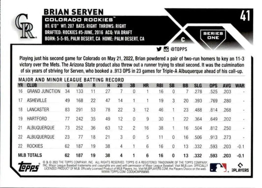 2023 Topps #41 Brian Serven NM-MT RC Rookie Colorado Rockies Baseball Card