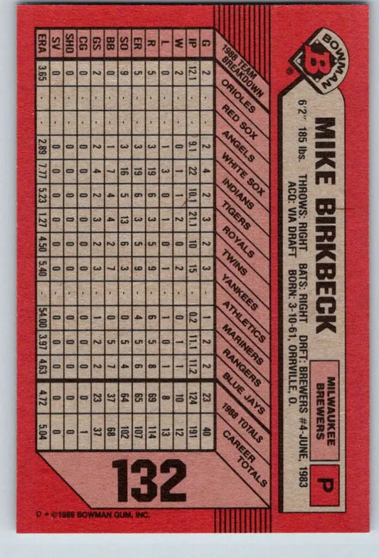 1989 Bowman #132 Mike Birkbeck NM-MT Milwaukee Brewers Baseball Card