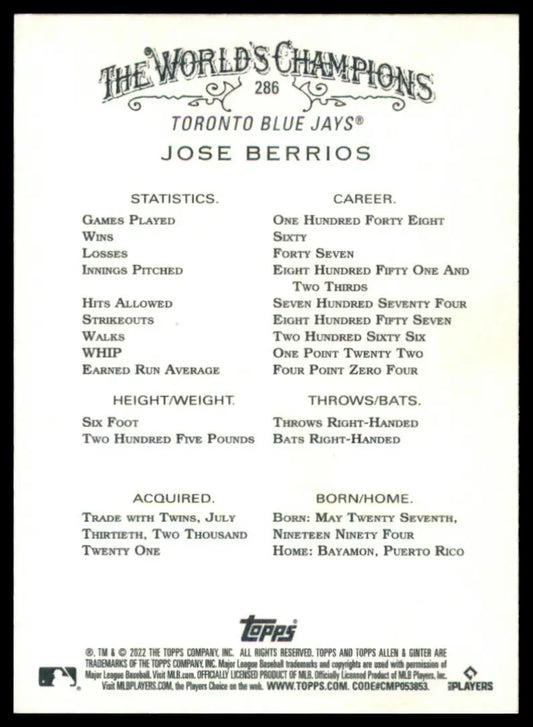 Jose Berrios 2022 Topps Allen & Ginter #286 Toronto Blue Jays