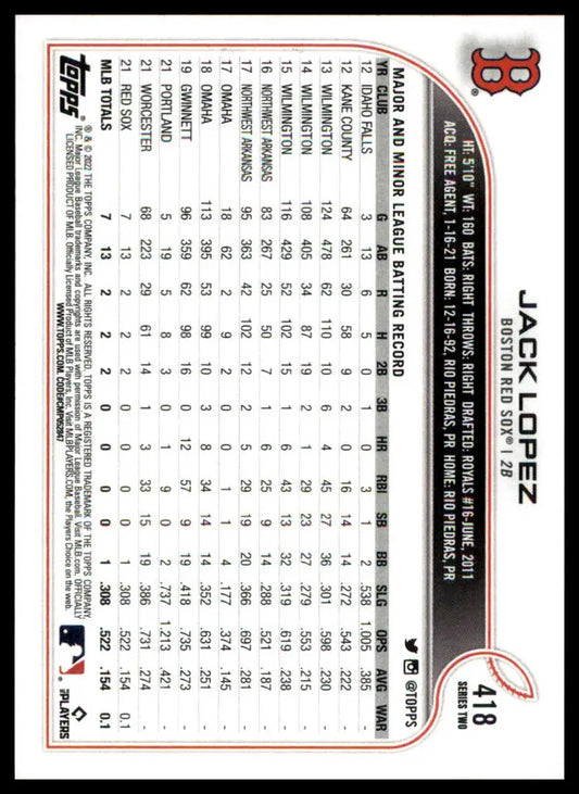 Jack Lopez Rookie 2022 Topps #418 Boston Red Sox