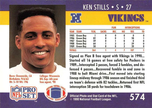 1990 Pro Set #574 Ken Stills NM-MT RC Rookie Minnesota Vikings Football Card