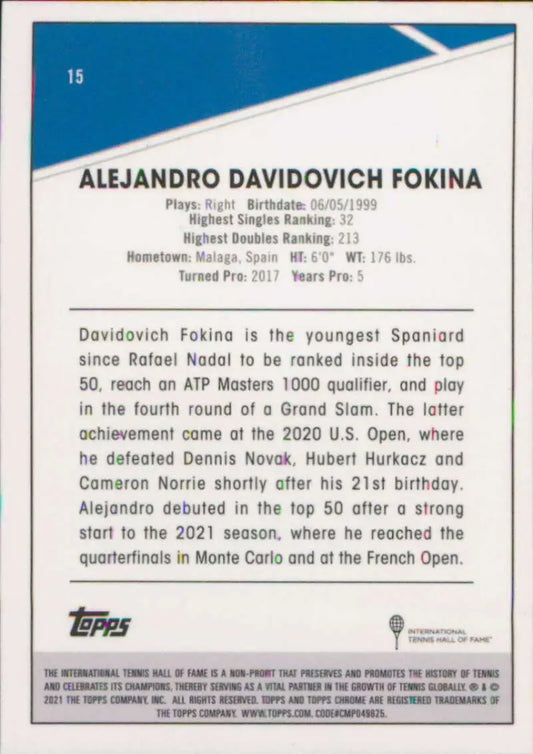 2021 Topps Chrome #15 Alejandro Davidovich Fokina NM-MT Tennis Card