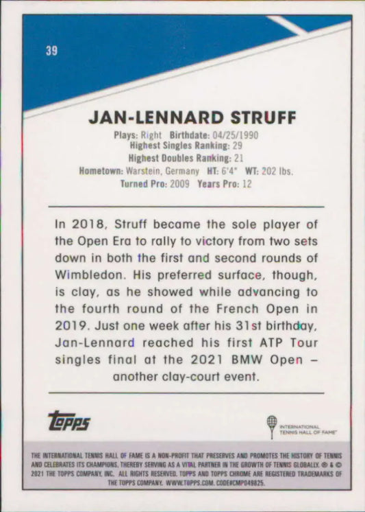 2021 Topps Chrome #39 Jan-Lennard Struff NM-MT Tennis Card