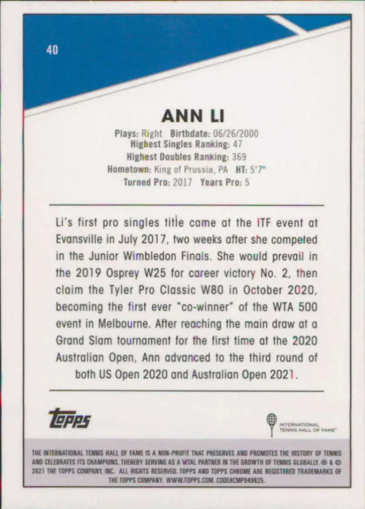 2021 Topps Chrome #40 Ann Li NM-MT Tennis Card