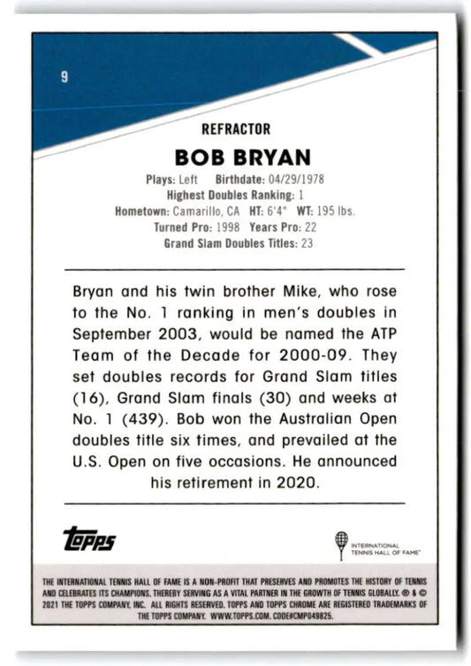 2021 Topps Chrome Refractor #9 Bob Bryan NM-MT Tennis Card