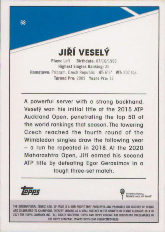 2021 Topps Chrome #68 Jiri Vesely NM-MT Tennis Card