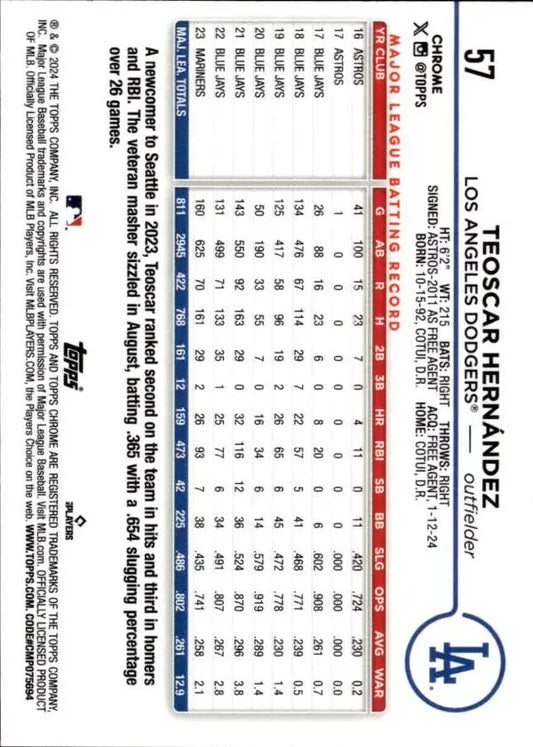 2024 Topps Chrome #57 Teoscar Hernandez NM-MT Los Angeles Dodgers Baseball Card