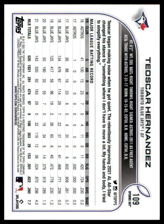 Teoscar Hernandez 2022 Topps Opening Day #109 Toronto Blue Jays