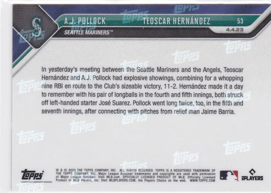 2023 TOPPS NOW #53 AJ POLLOCK & TEOSCAR HERNANDEZ- SEATTLE MARINERS