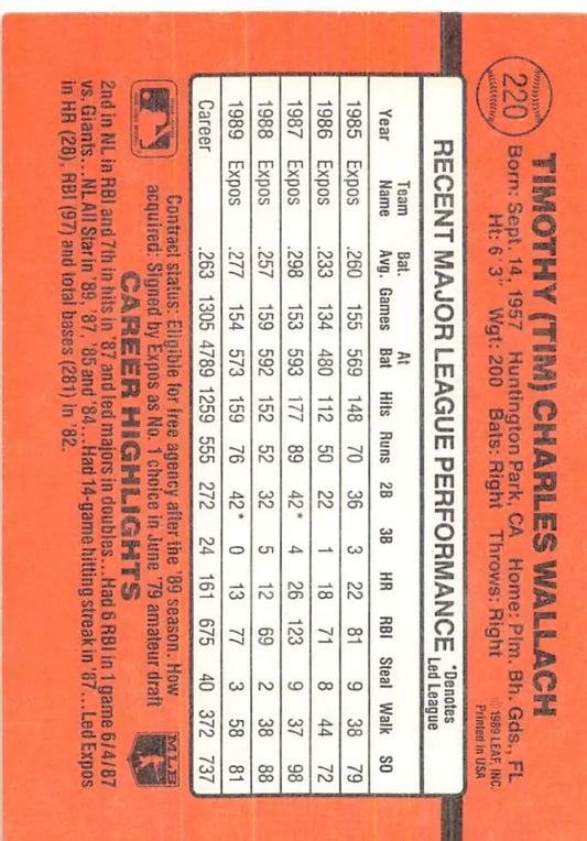 1991 Topps #220 Tim Wallach NM-MT Montreal Expos Baseball Card