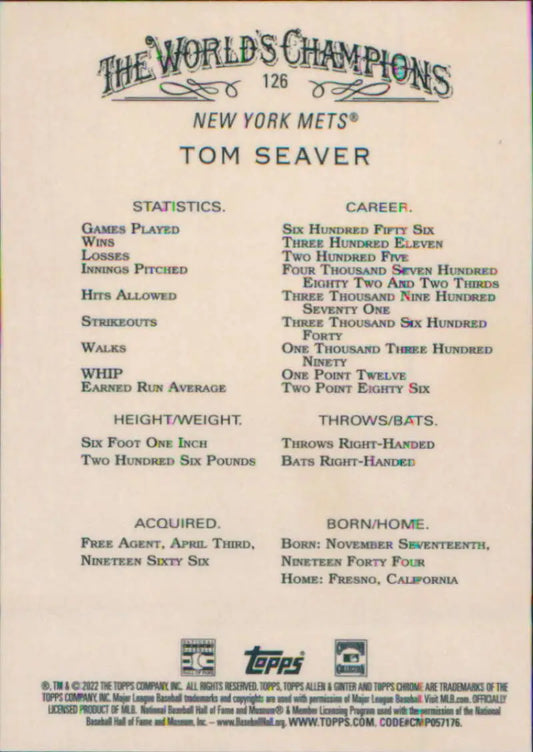 2022 Topps Allen and Ginter Chrome #126 Tom Seaver NM-MT New York Mets Baseball Card