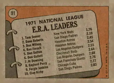 1972 Topps #91 N.L. E.R.A. Leaders (Tom Seaver / Dave Roberts / Don Wilson) EX-M