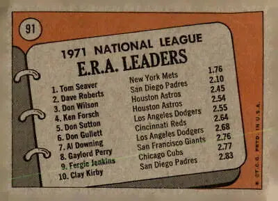 1972 Topps #91 N.L. E.R.A. Leaders (Tom Seaver )Dave Roberts / Don Wilson EX-MT